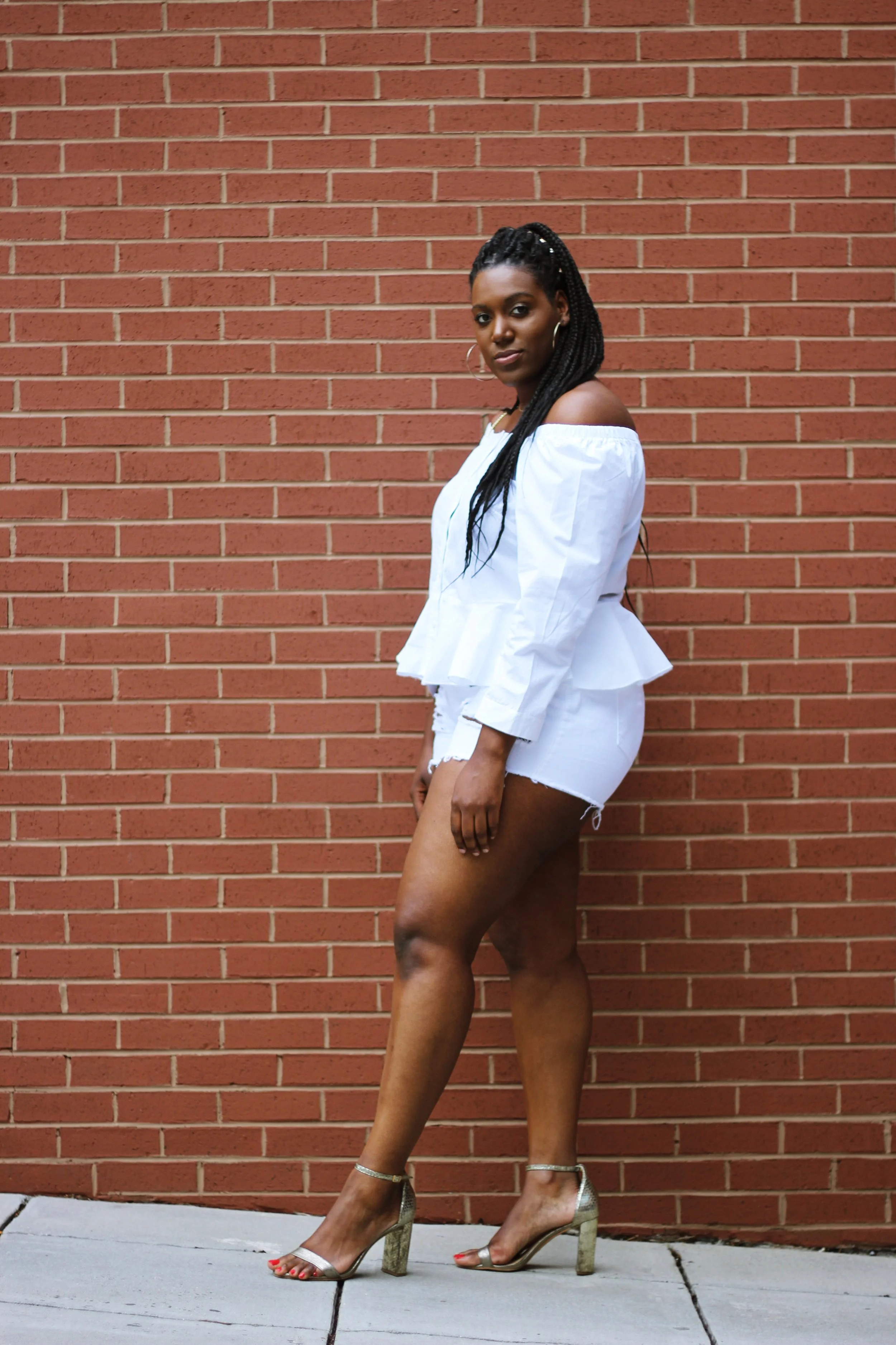 I found this white button down at ASOS. I'm a fan of the off the shoulder trend, so this top was a no brainer for me. I threw on a pair of white distressed jeans as a fun play against the polished look of the top, and used my shoes, watch, and hair as opportunities to amp the look up a bit with some luxe gold details.