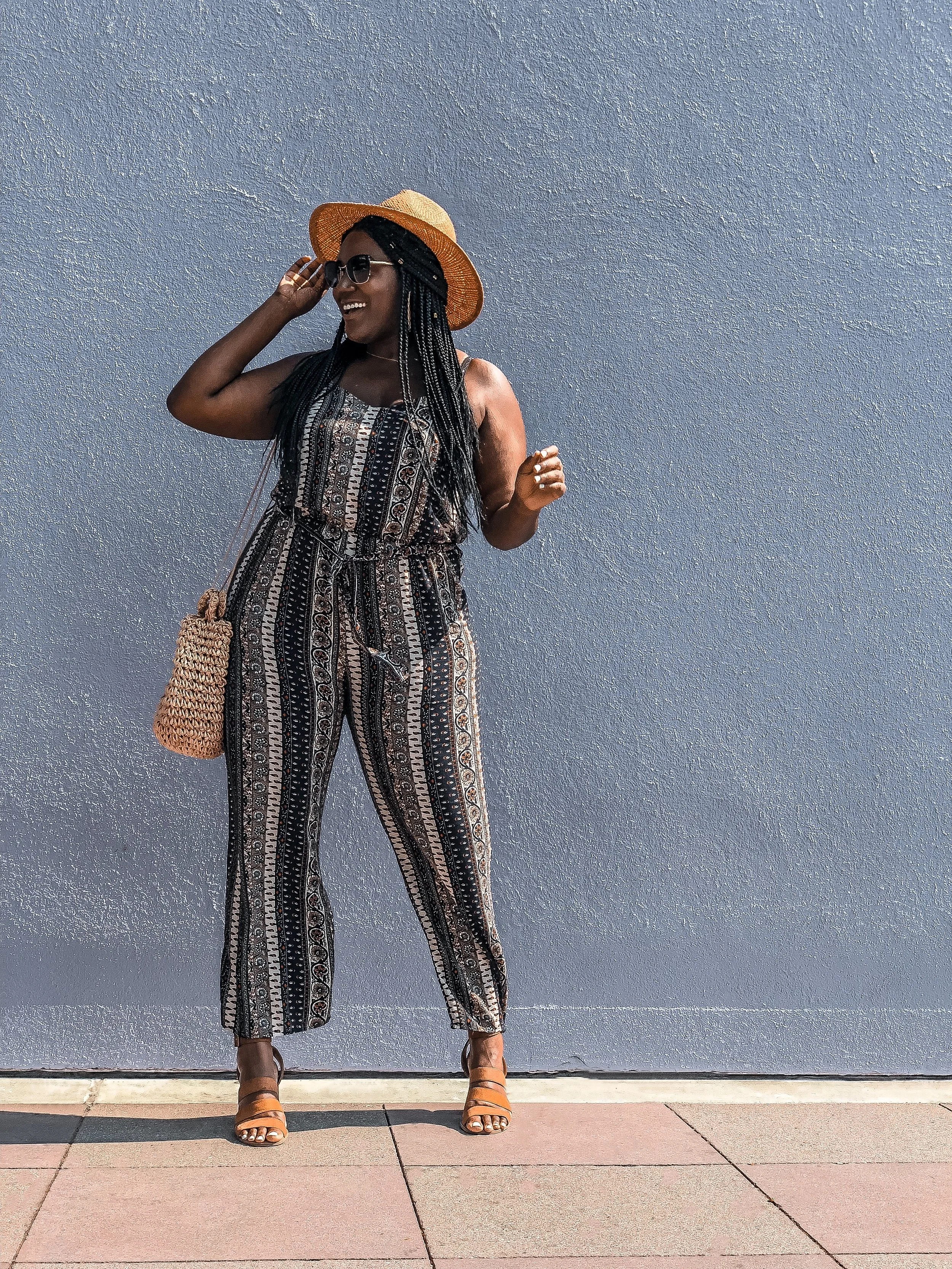 The next time you're at home, take a look at your summer staples. When I say summer staples, I mean pull out 4-6 of your favorite summer looks. For me, the red gingham dress I wore in Napa last week counts as a summer staple, but for this exercise I will pick the bohemian jumpsuit I'm wearing today instead, because it has higher potential to transition into fall. Now copy my thought process and do the same with your summer wardrobe. Once you're finished, pull out some of your favorite fall sweaters, jackets, and bottoms. From there, mix and match styles until you come up with ways to incorporate those summer staples in a way that's to your liking. Play your favorite playlist while you're at it - trust me, it's fun!