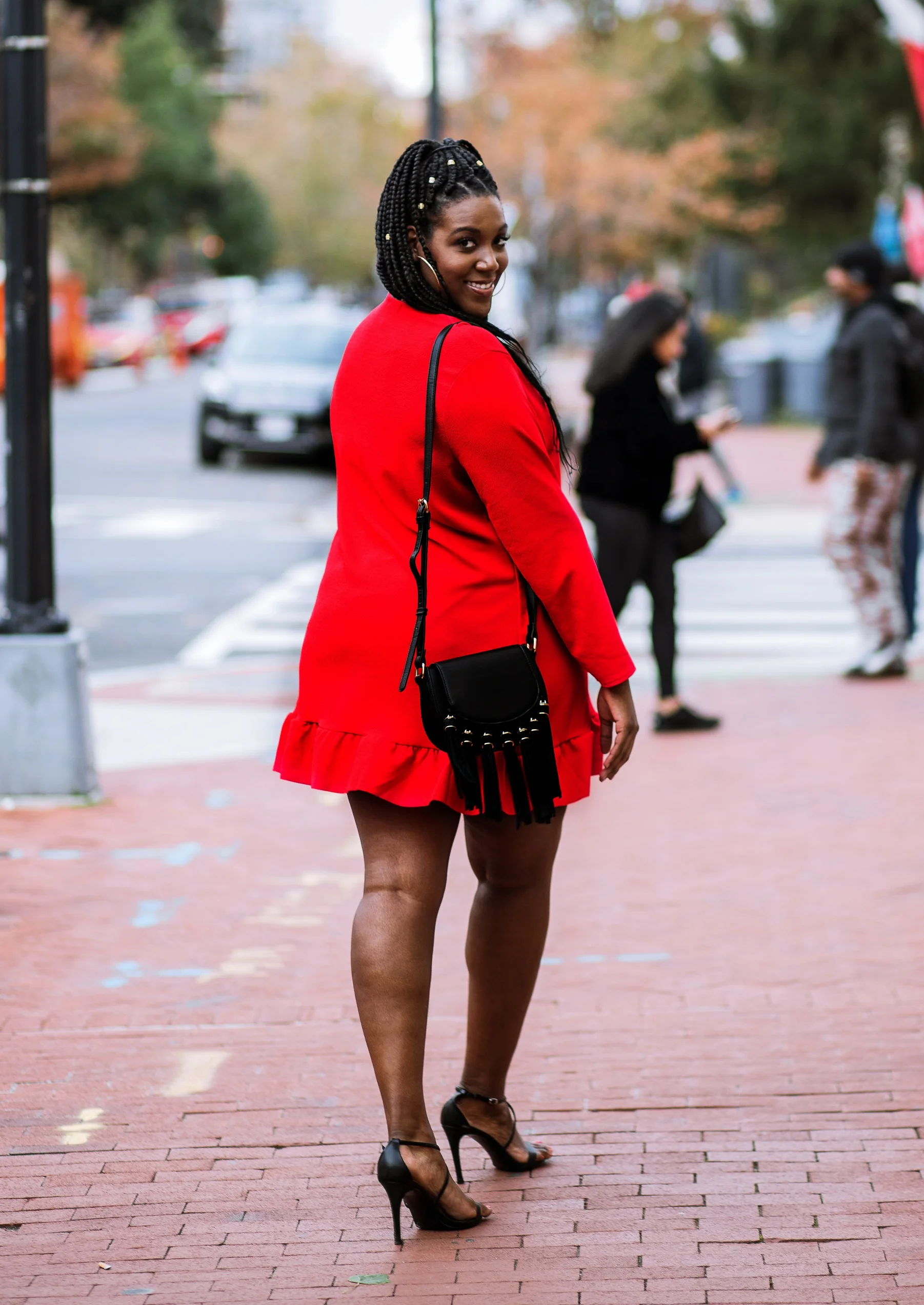 Whether you've been naughty or nice, red is always a solid choice. You've watched my love affair with the hue unfold in my red lace dress and on my trip to Barbados. Today's look from Boohoo is just as sweet! Whenever I'm on the hunt for fast fashion that won't break the bank, Boohoo is one of the first places that I look. When I laid eyes on this red ruffle blazer, I knew that I wanted to wear it as a dress, so I sized up and submitted my order!