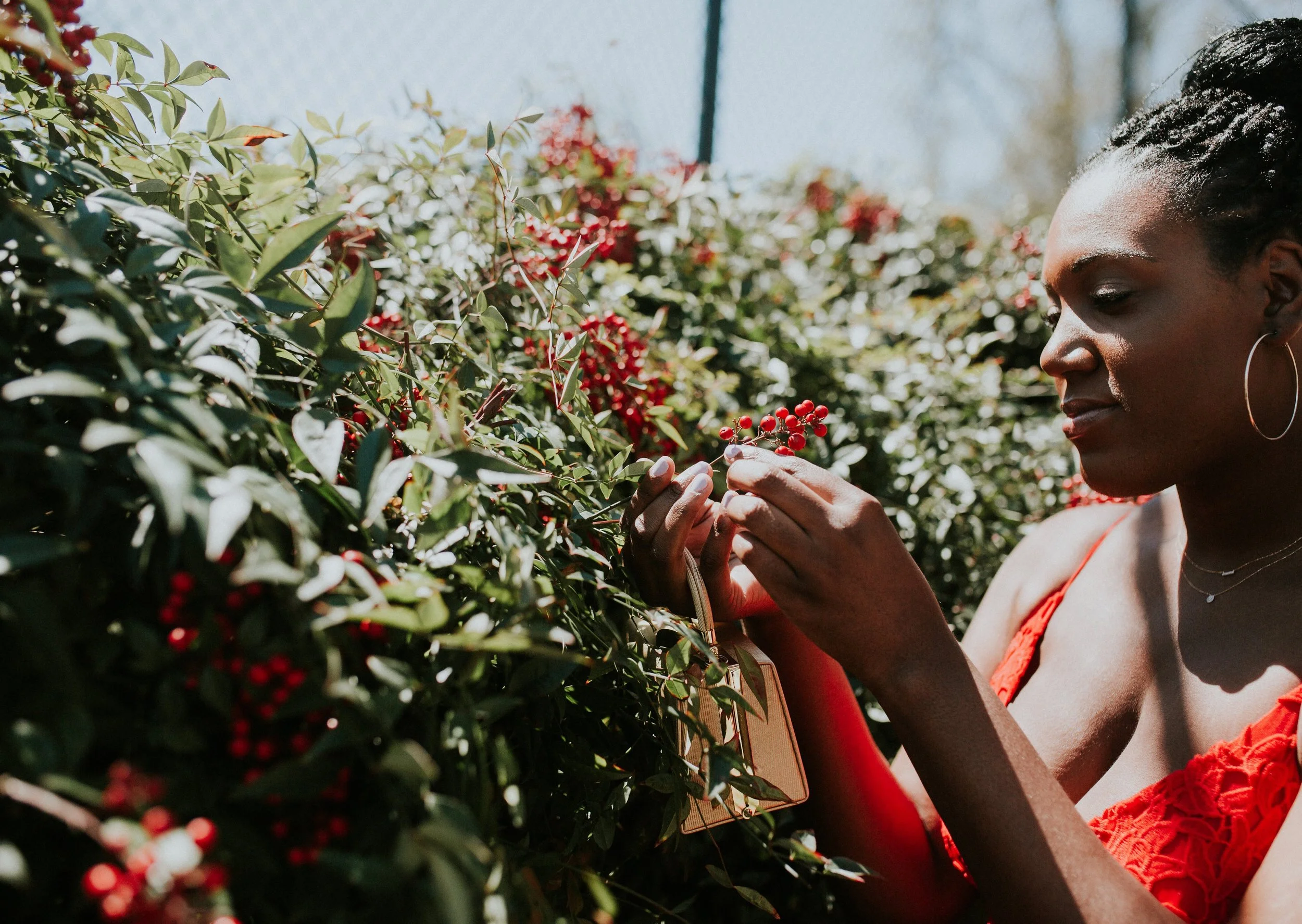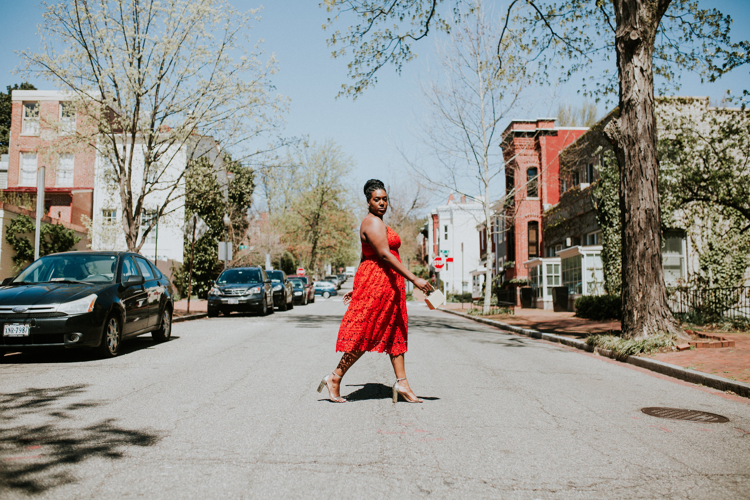 I adore this dress because it's extremely romantic. The lace detail coupled with the warm red hue is perfect for spring and summer celebrations of love. I'm also a huge fan of the adjustable straps. I can't resist a hint of glam, so I layered some gold accents into the look for ultimate spring vibes. Fun fact: the clutch that I'm wearing is actually a vintage clutch that my mom bought years ago in London for a wedding that she was attending! See how I dress it down here.