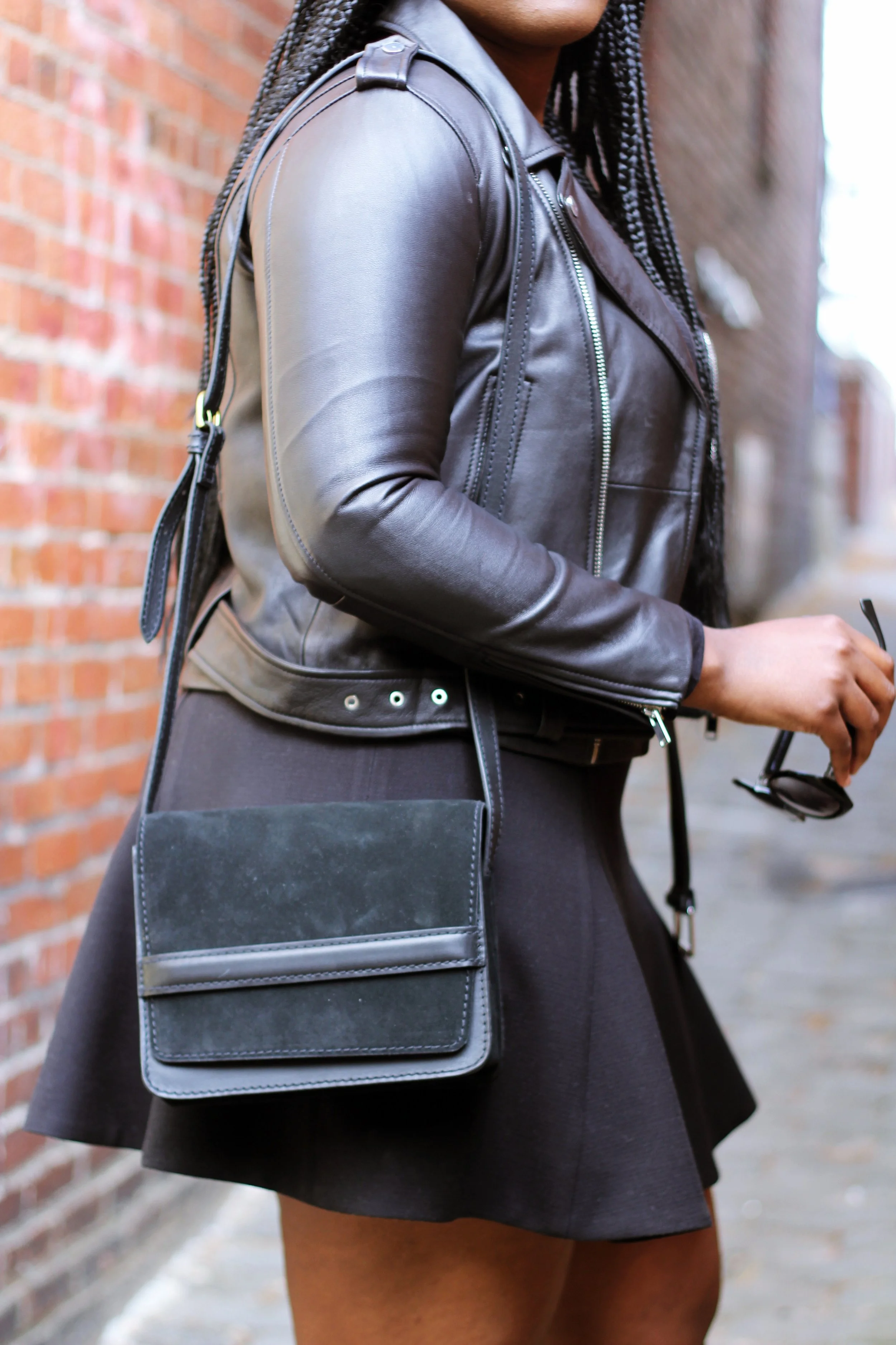 I love my Stuart Weitzman demiswoon boots. These suede wedges offer superb support, providing comfort all day long. I wear them to work, play, and everything in between. I decided to play up the dual texture of the boot in this all black look. To balance out my leather jacket, I grabbed my Albury Madewell clutch to tie everything together for a cohesive look. Be sure to scroll down for more details on how to get this look.